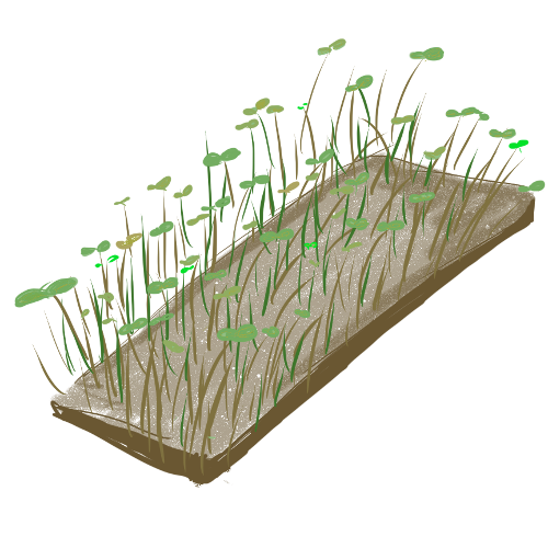 Quick "microgreen farming 101:" To get our microgreens, we load trays of soil with crowded seeds. Each tray contains a different plant or sometimes a mixture: sunflowers, radishes, broccoli, etc. All of these seeds would eventually become a plant, producing tall, happy yellow flowers, or pungently bitter red root balls, but we only let them grow for 7-15 days. Then we harvest hundreds of tiny plants before they even look like their mommies.